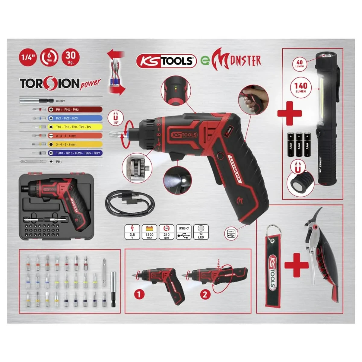 Indhold | Bits-skruetrækker, torsionsbits, lommelygte, proptrækker, nøglering m.m. |